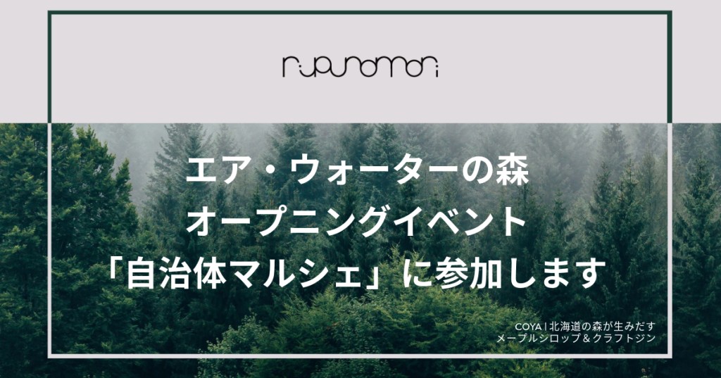 エア・ウォーターの森オープニングイベント「自治体マルシェ」にて占冠産メープルシロップ「トペニワッカ」とクラフトジン、リキュール「ルプノモリ」シリーズを販売いたします。